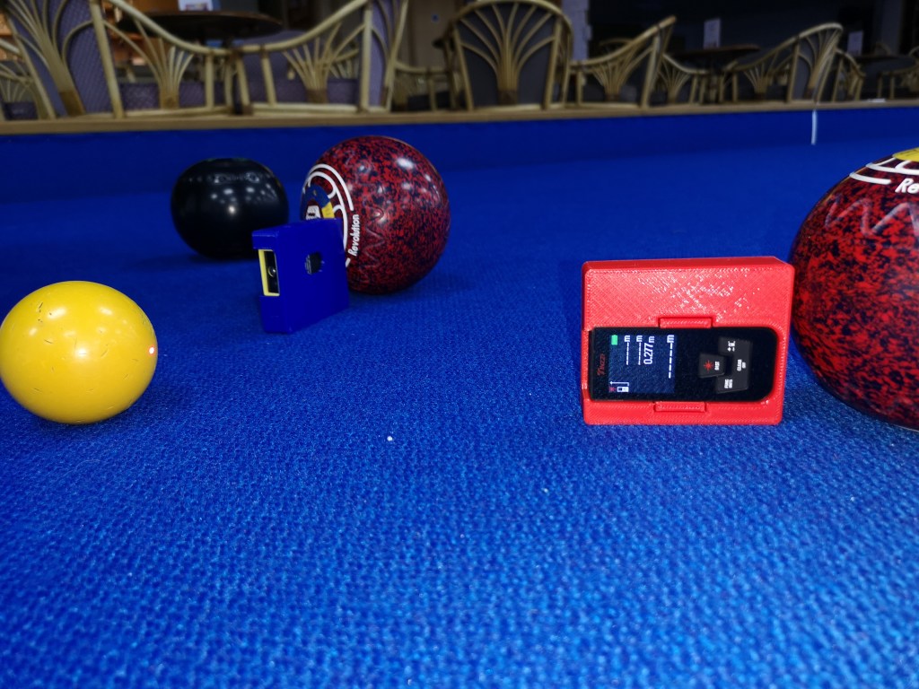 This measure differs from previous laser measures in that it is cheaper, smaller, fits in a pocket and measures from the bowl to the jack. The reason for measuring to the jack is the jack is of a constant diameter and the laser is arranged to aim at the middle of the jack thereby giving consistent accurate measures. Bowls are of varying size and measuring to the bowl decreases accuracy due to the variable aiming of the laser. Measure up to 4 bowls at a time and compare distances on screen. Measures shorter and longer distances to string measures.